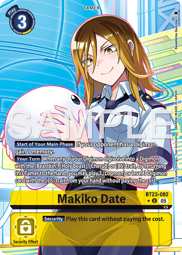 Makiko Date BT23-082 U CS [Start of Your Main Phase] If your opponent has a Digimon, gain 1 memory. [Your Turn] When any of your Digimon digivolve into a Digimon with the [Beastkin], [Holy Beast], [Cherub] or [CS] trait, by returning this Tamer to the hand, you may play 1 [Lopmon] or level 3 Digimon card with the [CS] trait from your hand without paying the cost. --- [Security] Play this card without paying the cost.