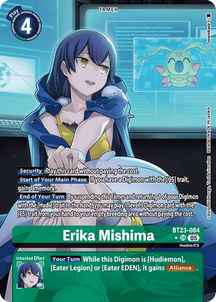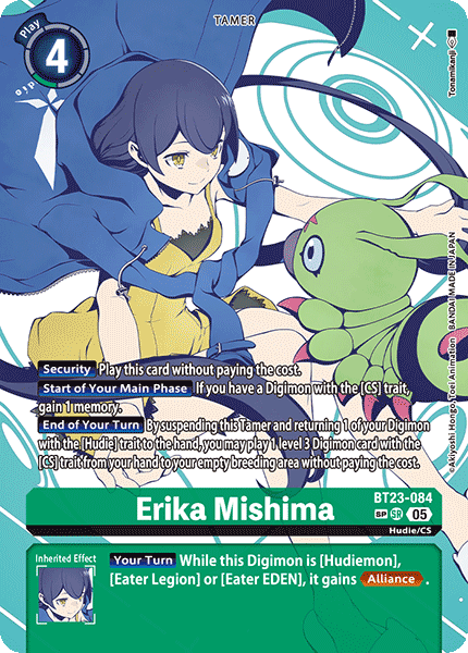 Erika Mishima BT23-084 SR Hudie/CS [Security] Play this card without paying the cost. [Start of Your Main Phase] If you have a Digimon with the [CS] trait, gain 1 memory. [End of Your Turn] By suspending this Tamer and returning 1 of your Digimon with the [Hudie] trait to the hand, you may play 1 level 3 Digimon card with the [CS] trait from your hand to your empty breeding area without paying the cost. --- [Your Turn] While this Digimon is [Hudiemon], [Eater Legion] or [Eater EDEN], it gains <Alliance>.