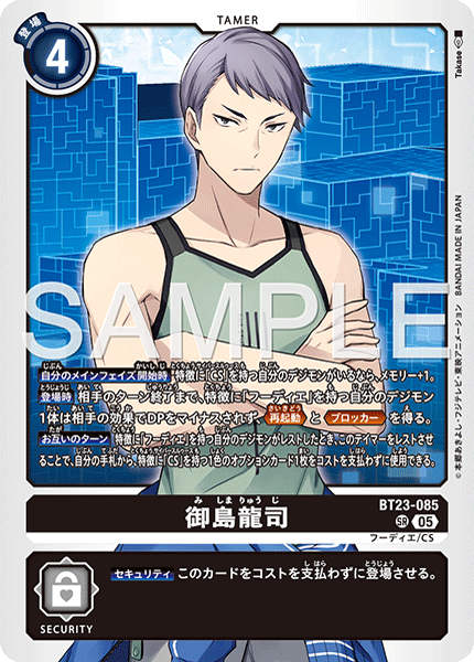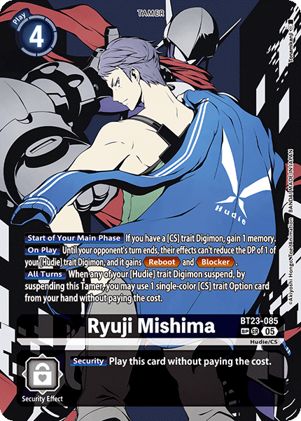 Ryuji Mishima BT23-085 SR Hudie/CS [Start of Your Main Phase] If you have a [CS] trait Digimon, gain 1 memory. [On Play] Until your opponent's turn ends, their effects can't reduce the DP of 1 of your [Hudie] trait Digimon, and it gains <Reboot> and <Blocker>. [All Turns] When any of your [Hudie] trait Digimon suspend, by suspending this Tamer, you may use 1 single-color [CS] trait Option card from your hand without paying the cost. --- [Security] Play this card without paying the cost.