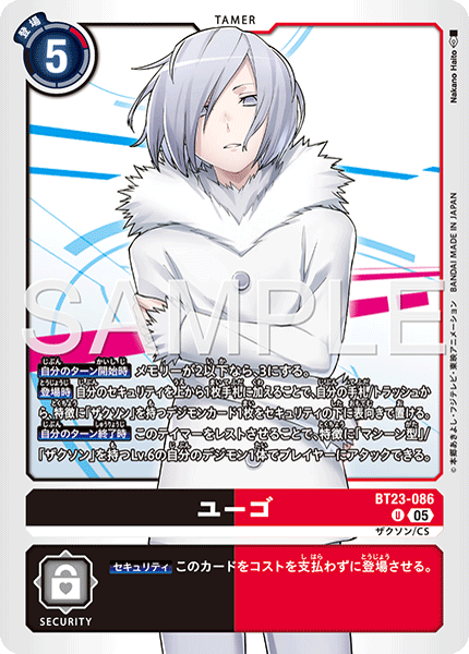 ユーゴ BT23-086 U ザクソン/CS 【自分のターン開始時】メモリーが2以下なら、3にする。 【登場時】自分のセキュリティを上から1枚手札に加えることで、自分の手札/トラッシュから、特徴に「ザクソン」を持つデジモンカード1枚をセキュリティの下に表向きで置ける。 【自分のターン終了時】このテイマーをレストさせることで、特徴に「マシーン型」/「ザクソン」を持つLv.6の自分のデジモン1体でプレイヤーにアタックできる。 --- 【セキュリティ】このカードをコストを支払わずに登場させる。