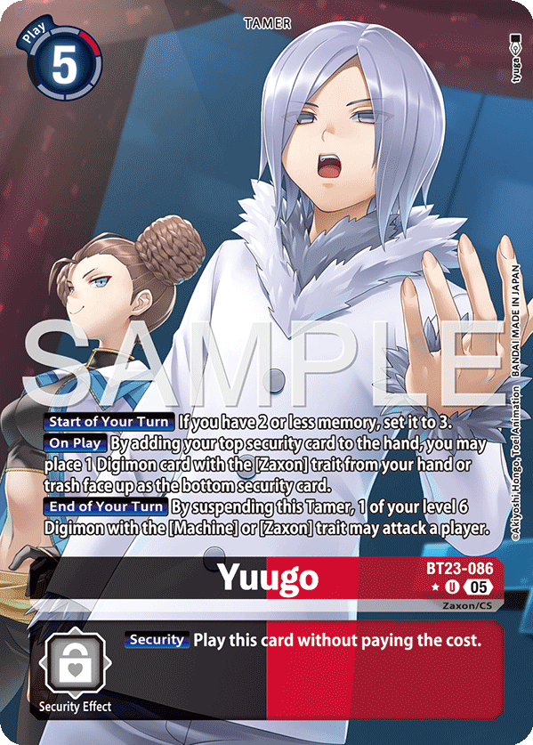 Yuugo BT23-086 U Zaxon/CS [Start of Your Turn] If you have 2 or less memory, set it to 3. [On Play] By adding your top security card to the hand, you may place 1 Digimon card with the [Zaxon] trait from your hand or trash face up as the bottom security card. [End of Your Turn] By suspending this Tamer, 1 of your level 6 Digimon with the [Machine] or [Zaxon] trait may attack a player. --- [Security] Play this card without paying the cost.
