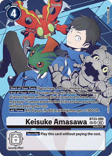 Keisuke Amasawa BT23-090 SR Hudie/CS [Start of Your Turn] If you have 2 or less memory, set it to 3. [End of Your Turn] By suspending this Tamer and returning 1 of your Digimon with the [Hudie] trait to the hand, you may play 1 Tamer card with the [CS] trait from your hand without paying the cost. [All Turns] All of your [Hudie] trait Digimon get +1000 DP. --- [Security] Play this card without paying the cost.