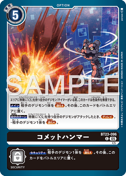 コメットハンマー BT23-096 C CS エリアに特徴に「CS」を持つ自分のデジモン/テイマーがいる間、このカードは色条件を無視できる。 【メイン】相手のデジモン1体を≪退化4≫。その後、このカードをバトルエリアに置く。 【自分のターン】特徴に「CS」を持つ自分のデジモンがアタックしたとき、≪ディレイ≫。 • 相手のデジモン1体を≪退化4≫。 --- 【セキュリティ】相手のデジモン1体を≪退化4≫。その後、このカードをバトルエリアに置く。