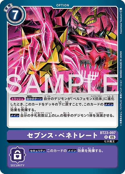 [Security] Activate this card's [Main] effects.Seventh Penetration BT23-097 R Seven Great Demon Lords [Trash] [Your Turn] When any of your Digimon digivolve into [Belphemon (X Antibody)], by returning this card to the bottom of the deck, activate this card's [Main] effects. [Main] Delete 1 of your opponent's Digimon with a level as high or higher as the number of cards in your hand. --- [Security] Activate this card's [Main] effect.