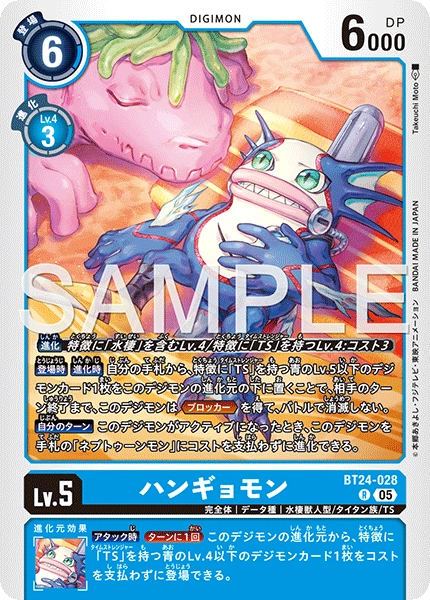 Lv.5 ハンギョモン BT24-028 R 完全体 | データ種 | 水棲獣人型/タイタン族/TS 【登場時】【進化時】自分の手札から、特徴に「TS」を持つ青のLv.5以下のデジモンカード1枚をこのデジモンの進化元の下に置くことで、相手のターン終了まで、このデジモンは≪ブロッカー≫を得て、バトルで消滅しない。 【自分のターン】このデジモンがアクティブになったとき、このデジモンを手札の「ネプトゥーンモン」にコストを支払わずに進化できる。 --- 【アタック時】[ターンに1回]このデジモンの進化元から、特徴に「TS」を持つ青のLv.4以下のデジモンカード1枚をコストを支払わずに登場できる。