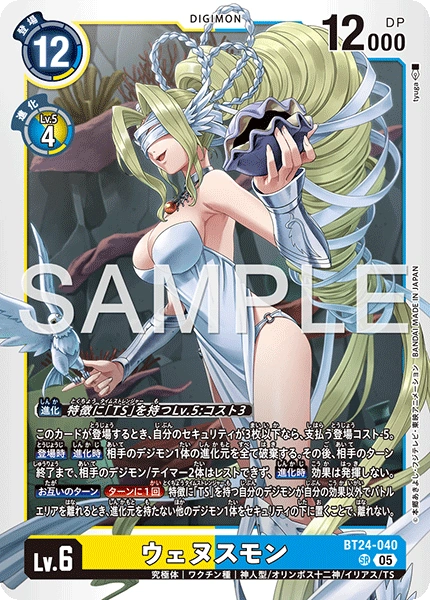 Lv.6 ウェヌスモン BT24-040 SR 究極体 | ワクチン種 | 神人型/オリンポス十二神/イリアス/TS このカードが登場するとき、自分のセキュリティが3枚以下なら、支払う登場コスト-5。 【登場時】【進化時】相手のデジモン1体の進化元を全て破棄する。その後、相手のターン終了まで、相手のデジモン/テイマー2体はレストできず、【進化時】効果は発揮しない。 【お互いのターン】[ターンに1回]特徴に「TS」を持つ自分のデジモンが自分の効果以外でバトルエリアを離れるとき、進化元を持たない他のデジモン1体をセキュリティの下に置くことで、離れない。 ---