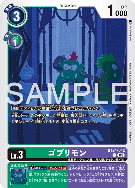 Lv.3 ゴブリモン BT24-042 C 成長期 | ウィルス種 | 鬼人型/タイタン族/TS 【自分のターン】このデジモンが特徴に「鬼人型」/「タイタン族」を持つデジモンカードに進化するとき、支払う進化コスト-1。 --- 【自分のターン】[ターンに1回]自分の手札が破棄されたとき、特徴に「鬼人型」/「タイタン族」を持つこのデジモンをトラッシュの「タイタモン」か特徴に「タイタン族」を持つデジモンカードに支払う進化コスト-1で進化できる。