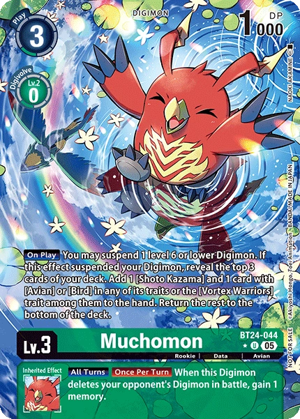 Lv.3 Muchomon BT24-044 U rookie | Data | Avian [On Play] You may suspend 1 level 6 or lower Digimon. If this effect suspended your Digimon, reveal the top 3 cards of your deck. Add 1 [Shoto Kazama] and 1 card with [Avian] or [Bird] in any of its traits or the [Vortex Warriors] trait among them to the hand. Return the rest to the bottom of the deck. --- [All Turns] [Once Per Turn] When this Digimon deletes your opponent's Digimon in battle, gain 1 memory.
