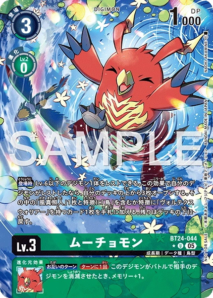 Lv.3 ムーチョモン BT24-044 U 成長期 | データ種 | 鳥型 【登場時】Lv.6以下のデジモン1体をレストできる。この効果で自分のデジモンがレストしたなら、自分のデッキの上から3枚オープンする。その中の「風真照人」1枚と特徴に「鳥」を含むか特徴に「ヴォルテクスウォリアー」を持つカード1枚を手札に加える。残りはデッキの下に戻す。 --- 【お互いのターン】[ターンに1回]このデジモンがバトルで相手のデジモンを消滅させたとき、メモリー+1。