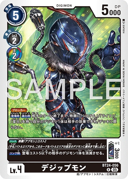 Lv.4 Dezipmon BT24-056 R Sup./Appmon | System | Zip/Unzip <Blocker> [On Play] [When Digivolving] Until your opponent's turn ends, their effects can't return 1 of your Digimon with the [System], [Life] or [Transmutation] trait to hands or decks. --- <Link> [Appmon] trait: Cost 2 (Plug this card from the hand or battle area sideways into the specified Digimon in the battle area.) Link: [When Linking] Delete 1 of your opponent's play cost 5 or lower Digimon. Link: [Linked Together] DP+3000