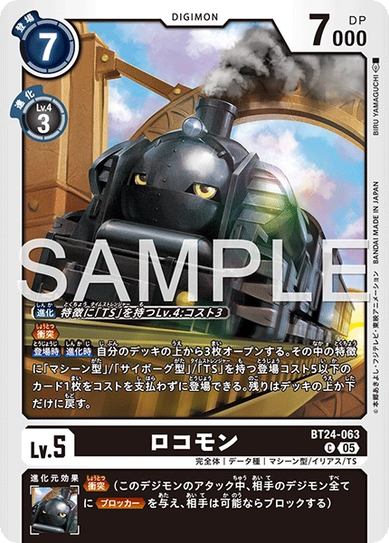 Lv.5 Locomon BT24-063 C Ultimate | Data | Machine/Iliad/TS [Digivolve] Lv.4 w/[TS] trait: Cost 3 <Collision> (During this Digimon's attack, all of your opponent's Digimon gain <Blocker>, and the opponent blocks if able.) [On Play] [When Digivolving] Reveal the top 3 cards of your deck. You may play 1 play cost 5 or lower [Machine], [Cyborg] or [TS] trait card among them without paying the cost. Return the rest to the top or bottom of the deck. --- <Collision> (During this Digimon's attack, give all of your opponent's Digimon <Blocker>, and the opponent blocks if able.)