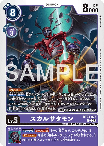 Lv.5 スカルサタモン BT24-073 C 完全体 | ウィルス種 | アンデッド型 ≪ブロッカー≫ 【進化時】【消滅時】相手のトラッシュが10枚以下なら、お互いのデッキの上から3枚破棄する。その後、相手のトラッシュが10枚以上なら、自分のトラッシュから、特徴に「小悪魔型」/「堕天使型」を持つLv.4以下のデジモンカード1枚をコストを支払わずに登場できる。 〈ルール〉特徴:タイプ「堕天使型」を持つ。 --- 【アタック時】[ターンに1回]ターン終了まで、このデジモンは≪Sアタック+1≫を得る。相手のトラッシュが10枚以下なら、代わりにお互いのデッキの上から2枚破棄する。