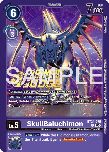 Lv.5 SkullBaluchimon BT24-075 U Ultimate | Data | Undead/X Antibody/Titan/TS [Digivolve] Lv.4 w/[Demon]/[TS] trait: Cost 3 [On Play] [When Digivolving] By trashing 1 card in your hand, delete 1 each of your opponent's level 3 and level 4 Digimon. --- [Your Turn] While this Digimon is [Titamon] or has the [Titan] trait, it gains <Security A. +1>.