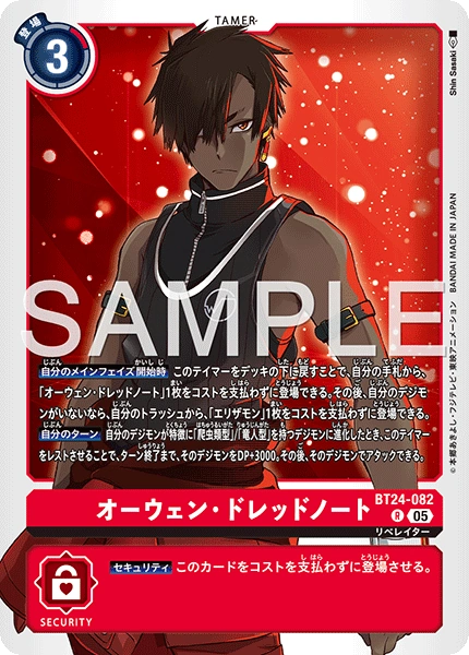 オーウェン• ドレッドノート BT24-082 R リベレイター 【自分のメインフェイズ開始時】このテイマーをデッキの下に戻すことで、自分の手札から、「オーウェン• ドレッドノート」1枚をコストを支払わずに登場できる。その後、自分のデジモンがいないなら、自分のトラッシュから、「エリザモン」1枚をコストを支払わずに登場できる。 【自分のターン】自分のデジモンが特徴に「爬虫類型」/「竜人型」を持つデジモンに進化したとき、このテイマーをレストさせることで、ターン終了まで、そのデジモンをDP+3000。その後、そのデジモンでアタックできる。 --- 【セキュリティ】このカードをコストを支払わずに登場させる。