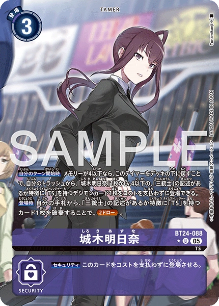 城木明日奈 BT24-088 U TS 【自分のターン開始時】メモリーが4以下なら、このテイマーをデッキの下に戻すことで、自分のトラッシュから、「城木明日奈」1枚かLv.4以下の、「三銃士」の記述があるか特徴に「TS」を持つデジモンカード1枚をコストを支払わずに登場できる。 【登場時】自分の手札から、「三銃士」の記述があるか特徴に「TS」を持つカード1枚を破棄することで、≪2ドロー≫。 --- 【セキュリティ】このカードをコストを支払わずに登場させる。