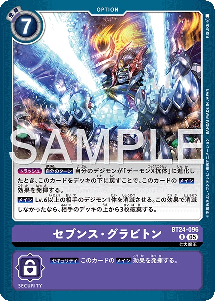[Security] Activate this card's [Main] effects.Seventh Graviton BT24-096 R Seven Great Demon Lords [Trash] [Your Turn] When any of your Digimon digivolve into [Creepymon (X Antibody)], by returning this card to the bottom of the deck, activate its [Main] effects. [Main] Delete 1 of your opponent's level 6 or higher Digimon. If this effect didn't delete, trash the top 3 cards of your opponent's deck. --- [Security] Activate this card's [Main] effect.