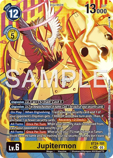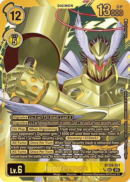 Lv.6 Jupitermon BT24-101 SEC Mega | Vaccine | Shaman/Olympos XII/Iliad/TS [On Play] [When Digivolving] Trash your top security card and 1 of your opponent's Digimon gets -13000 DP until their turn ends. Then, if you have 1 or fewer security cards, <Recovery +2 ≪Deck≫>. [All Turns] [Once Per Turn] When your security stack is removed from, trash your opponent's top security card. [All Turns] [Once Per Turn] When any of your [TS] trait Digimon or Tamers would leave the battle area, by trashing your top security card, they don't leave. ---
