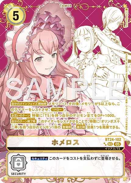 Homeros BT24-102 SEC Iliad/TS [Start of Your Main Phase] Gain 1 memory. Then, if you have 5 or more memory, suspend this Tamer and <Draw 1>. [All Turns] All of your [TS] trait Digimon get +1000 DP. [End of Your Turn] By suspending this Tamer, you may activate 1 [On Play] or [When Digivolving] effect of 1 of your [Olympos XII] trait Digimon. --- [Security] Play this card without paying the cost.