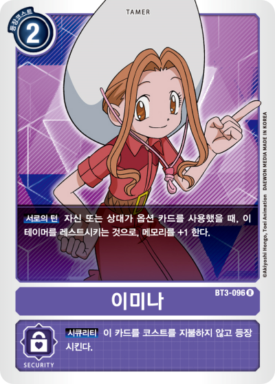 Mimi Tachikawa BT3-096 R [All Turns] When a player uses an Option card, you may suspend this Tamer to gain 1 memory. --- [Security] Play this card without paying its memory cost.