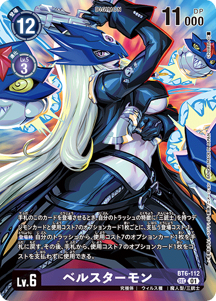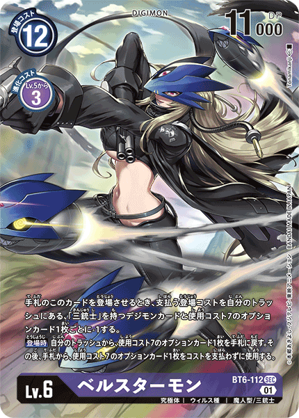 Lv.6 ベルスターモン BT6-112 SEC 究極体 | ウィルス種 | 魔人型/三銃士 手札のこのカードを登場させるとき、支払う登場コストを自分のトラッシュにある、「三銃士」を持つデジモンカードと使用コスト7のオプションカード1枚ごとに-1する。 【登場時】自分のトラッシュから、使用コスト7のオプションカード1枚を手札に戻す。その後、手札から、使用コスト7のオプションカード1枚をコストを支払わずに使用する。 ---