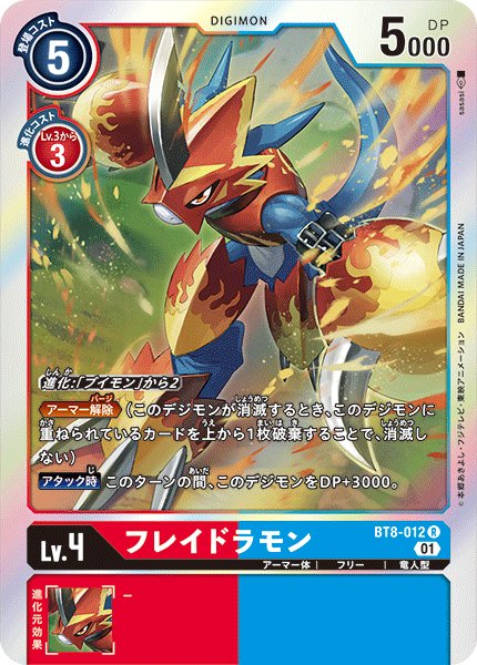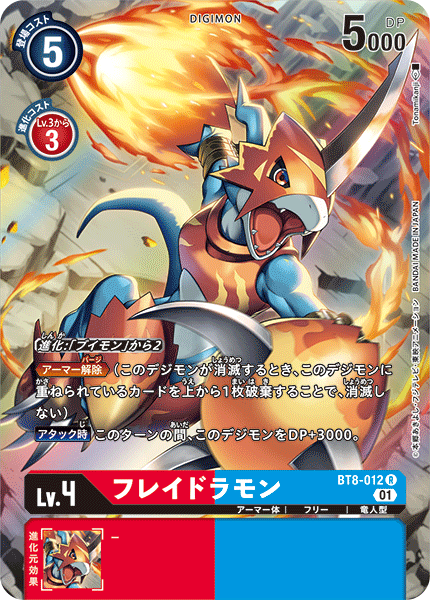 Lv.4 フレイドラモン BT8-012 R アーマー体 | フリー | 竜人型 ≪アーマー解除≫(このデジモンが消滅するとき、このデジモンに重ねられているカードを上から1枚破棄することで、消滅しない) 【アタック時】このターンの間、このデジモンをDP+3000。 ---