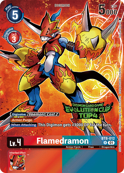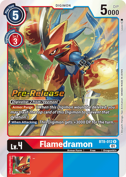 Lv.4 Flamedramon BT8-012 R Armor Form | Free | Dragonkin <Armor Purge> (When this Digimon would be deleted, you may trash the top card of this Digimon to prevent that deletion.) [When Attacking] This Digimon gets +3000 DP for the turn. ---
