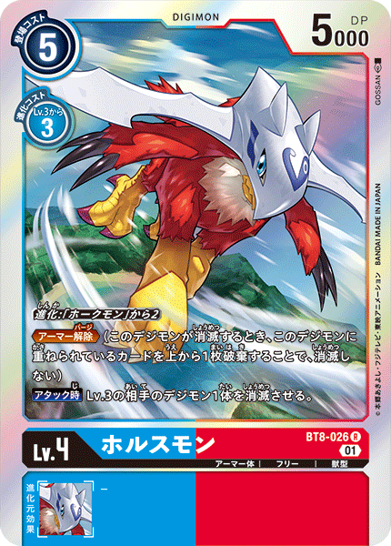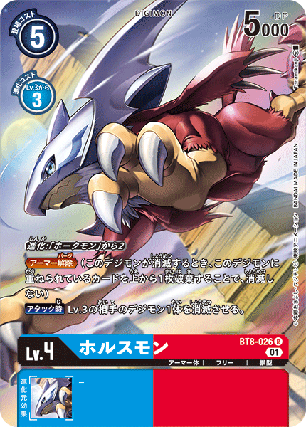 Lv.4 ホルスモン BT8-026 R アーマー体 | フリー | 獣型 ≪アーマー解除≫(このデジモンが消滅するとき、このデジモンに重ねられているカードを上から1枚破棄することで、消滅しない) 【アタック時】Lv.3の相手のデジモン1体を消滅させる。 ---