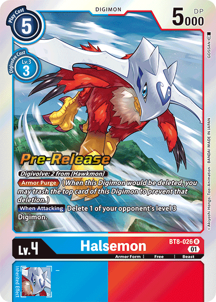 Lv.4 Halsemon BT8-026 R Armor Form | Free | Beast Digivolve: 2 from [Hawkmon].<Armor Purge> (When this Digimon would be deleted, you may trash the top card of this Digimon to prevent that deletion.)[When Attacking] Delete 1 of your opponent's level 3 Digimon. --- -