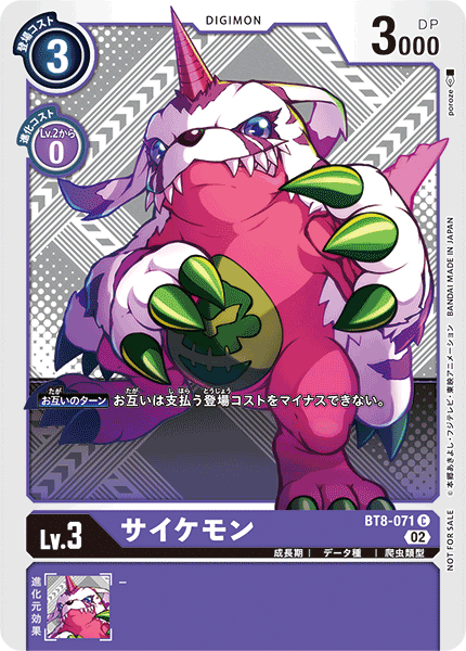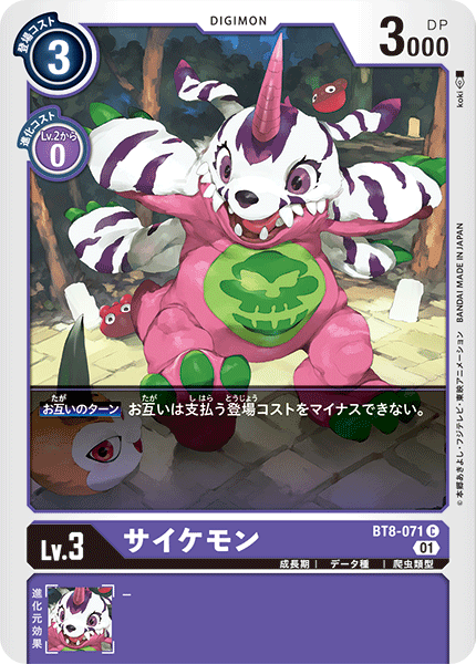 Lv.3 サイケモン BT8-071 C 成長期 | データ種 | 爬虫類型 【お互いのターン】お互いは支払う登場コストをマイナスできない。 ---