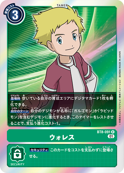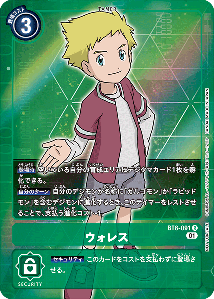 ウォレス BT8-091 R 【登場時】空いている自分の育成エリアにデジタマカード1枚を孵化できる。 【自分のターン】自分のデジモンが名称に「ガルゴモン」か「ラピッドモン」を含むデジモンに進化するとき、このテイマーをレストさせることで、支払う進化コスト-1。 --- 【セキュリティ】このカードをコストを支払わずに登場させる。