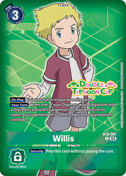 Willis BT8-091 R [On Play] You may hatch 1 Digi-Egg card to an empty space in your breeding area.[Your Turn] When one of your Digimon would digivolve into a Digimon with [Gargomon] or [Rapidmon] in its name, you may suspend this Tamer to reduce the digivolution cost by 1. --- [Security] Play this card without paying its memory cost.