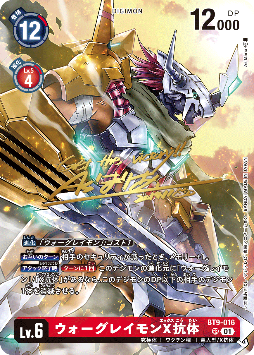 Lv.6 ウォーグレイモンX抗体 BT9-016 SR 究極体 | ワクチン種 | 竜人型/X抗体 【お互いのターン】相手のセキュリティが減ったとき、メモリー+1。 【アタック終了時】[ターンに1回]このデジモンの進化元に、「ウォーグレイモン」か「X抗体」があるとき、このデジモンのDP以下の相手のデジモン1体を消滅させる。 ---