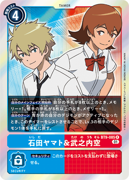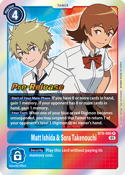 Matt Ishida & Sora Takenouchi BT9-085 R [Start of Your Main Phase] If you have 8 or more cards in hand, gain 1 memory. If your opponent has 8 or more cards in hand, gain 1 memory. [Your Turn] When one of your blue or red Digimon becomes unsuspended, you may suspend this Tamer to return 1 of your opponent's level 3 Digimon to its owner's hand. --- [Security] Play this card without paying its memory cost.