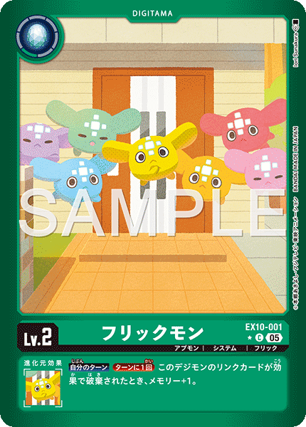 Lv.2 フリックモン EX10-001 C アプモン | システム | フリック --- 【自分のターン】[ターンに1回]このデジモンのリンクカードが効果で破棄されたとき、メモリー+1。