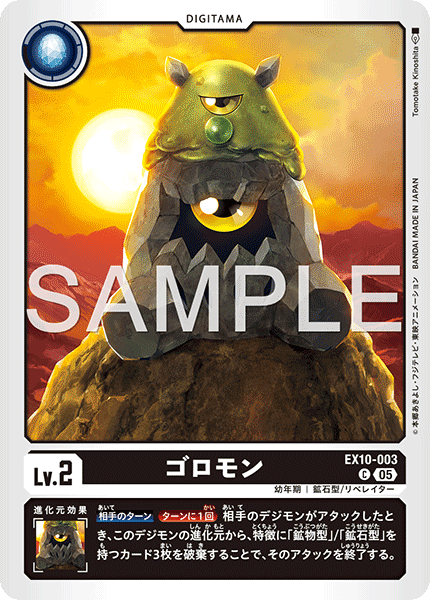 Lv.2 ゴロモン EX10-003 C 幼年期 | 鉱石型/リベレイター --- 【相手のターン】[ターンに1回]相手のデジモンがアタックしたとき、このデジモンの進化元から、特徴に「鉱物型」/「鉱石型」を持つカード3枚を破棄することで、そのアタックを終了する。