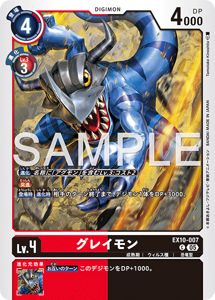Lv.4 グレイモン EX10-007 C 成熟期 | ウィルス種 | 恐竜型 ≪突進≫ 【登場時】【進化時】相手のターン終了まで、デジモン1体をDP+3000。 --- 【お互いのターン】このデジモンをDP+1000。