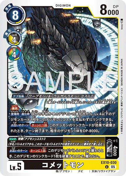 Lv.5 Cometmon EX10-030 U Ult./Appmon | Navi | Astronomy/Leviathan [App Fusion] [Warpmon] & [Weatherdramon]: Cost 0 If 2 such cards are linked together, stack the link card on top and digivolve. <Collision> (During this Digimon's attack, all of your opponent's Digimon gain <Blocker>, and the opponent blocks if able.) [On Play] [When Digivolving] You may link 1 level 4 or lower Digimon card from your hand or this Digimon's digivolution cards to this Digimon without paying the cost. [All Turns] [Once Per Turn] When effects trash any of this Digimon's link cards, 1 of your opponent's Digimon gets -8000 DP for the turn. --- <Link> [Appmon] trait: Cost 3 (Plug this card from the hand or battle area sideways into the specified Digimon in the battle area.) Link: [All Turns] [Once Per Turn] When this Digimon would leave the battle area, by trashing 1 of its link cards, it doesn't leave. Link: [Linked Together] +4000 DP
