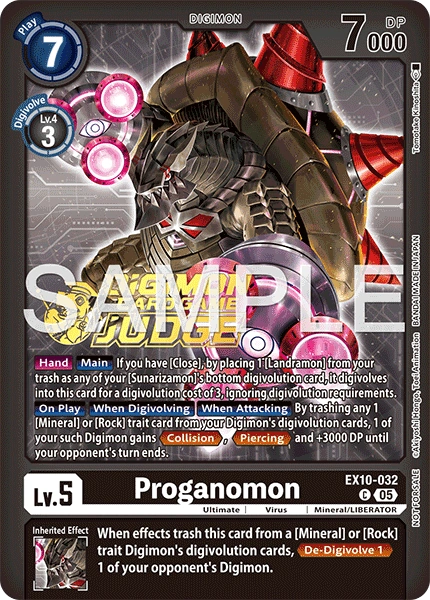 When effects trash this card from a [Mineral] or [Rock] trait Digimon's digivolution cards, <De-Digivolve 1> 1 of your opponent's Digimon.Lv.5 Proganomon EX10-032 C ultimate | Virus | Mineral/LIBERATOR [Hand] [Main] If you have [Close], by placing 1 [Landramon] from your trash as any of your [Sunarizamon]'s bottom digivolution card, it digivolves into this card for a digivolution cost of 3, ignoring digivolution requirements. [On Play] [When Digivolving] [When Attacking] By trashing any 1 [Mineral] or [Rock] trait card from your Digimon's digivolution cards, 1 of your such Digimon gains <Collision>, <Piercing> and +3000 DP until your opponent's turn ends. --- When effects trash this card from a [Mineral] or [Rock] trait Digimon's digivolution cards, <De-Digivolve 1> 1 of your opponent's Digimon.
