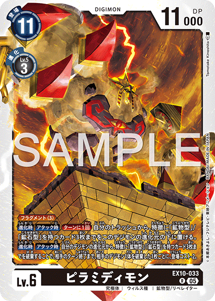 Lv.6 ピラミディモン EX10-033 R 究極体 | ウィルス種 | 鉱物型/リベレイター ≪フラグメント《3》≫ 【進化時】【アタック時】[ターンに1回]自分のトラッシュから、特徴に「鉱物型」/「鉱石型」を持つカード3枚までをこのデジモンの進化元の下に置ける。 【進化時】【アタック時】自分のデジモンの進化元から、特徴に「鉱物型」/「鉱石型」を持つカード3枚までを破棄することで、相手のターン終了まで、相手のデジモン1体を破棄した1枚ごとに、登場コスト-2。 ---