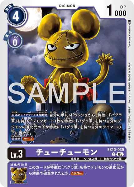 Lv.3 チューチューモン EX10-039 C 成長期 | ウィルス種 | 獣型/バグラ軍 【自分のメインフェイズ開始時】自分の手札/トラッシュから、特徴に「バグラ軍」を持つデジモンカード1枚を特徴に「バグラ軍」を持つ自分のデジモンの進化元の下か特徴に「バグラ軍」を持つ自分のテイマーの下に置ける。 【消滅時】≪セーブ≫ --- このカードが特徴に「バグラ軍」を持つデジモンの進化元から効果で破棄されたとき、≪1ドロー≫。