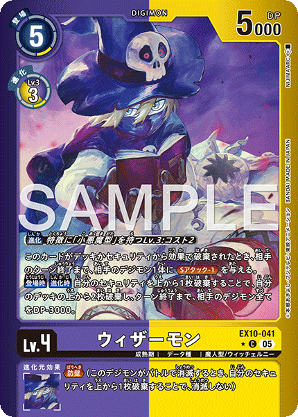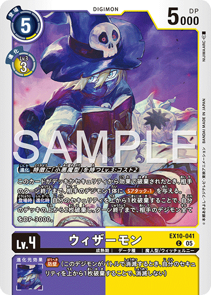 Lv.4 Wizardmon EX10-041 C Champion | Data | Wizard/Witchelny [Digivolve] Lv.3 w/[Evil] trait: Cost 2 When effects trash this card from the deck or security stack, give 1 of your opponent's Digimon <Security A. -1> until their turn ends. [On Play] [When Digivolving] By trashing your top security card, trash the top 2 cards of your deck and all of your opponent's Digimon get -3000 DP for the turn. --- <Barrier> (When this Digimon would be deleted in battle, by trashing your top security card, it isn't deleted.)