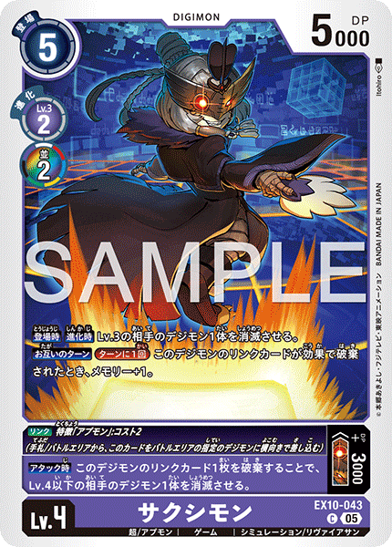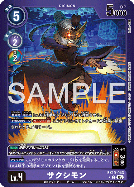 Lv.4 サクシモン EX10-043 C 超/アプモン | ゲーム | シミュレーション/リヴァイアサン 【登場時】【進化時】Lv.3の相手のデジモン1体を消滅させる。 【お互いのターン】[ターンに1回]このデジモンのリンクカードが効果で破棄されたとき、メモリー+1。 --- 〈リンク〉特徴「アプモン」:コスト2(手札/バトルエリアから、このカードをバトルエリアの指定のデジモンに横向きで差し込む) リンク: +DP+3000DP リンク: 【アタック時】このデジモンのリンクカード1枚を破棄することで、Lv.4以下の相手のデジモン1体を消滅させる。