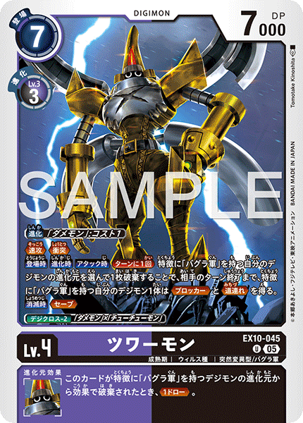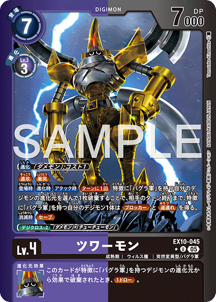 Lv.4 ツワーモン EX10-045 U 成熟期 | ウィルス種 | 突然変異型/バグラ軍 ≪速攻≫≪衝突≫ 【登場時】【進化時】【アタック時】[ターンに1回]特徴に「バグラ軍」を持つ自分のデジモンの進化元を選んで1枚破棄することで、相手のターン終了まで、特徴に「バグラ軍」を持つ自分のデジモン1体は≪ブロッカー≫と≪道連れ≫を得る。 【消滅時】≪セーブ≫ --- このカードが特徴に「バグラ軍」を持つデジモンの進化元から効果で破棄されたとき、≪1ドロー≫。