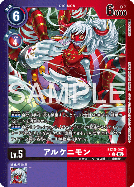 Lv.5 アルケニモン EX10-047 U 完全体 | ウィルス種 | 魔獣型 【登場時】自分の手札1枚を破棄することで、DP合計6000まで、相手のデジモンを消滅させる。 【消滅時】自分のトラッシュから、「ヴァンデモン」の記述があるテイマーカード1枚をコストを支払わずに登場できる。この効果では、自分のテイマーと同じ名称のカードは登場できない。 ---