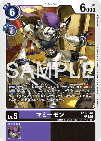 Lv.5 マミーモン EX10-051 U 完全体 | ウィルス種 | アンデッド型 【登場時】自分の手札1枚を破棄することで、相手のデジモン1体を≪退化1≫。 【消滅時】自分のトラッシュから、「ヴァンデモン」の記述があるテイマーカード1枚をコストを支払わずに登場できる。この効果では、自分のテイマーと同じ名称のカードは登場できない。 ---