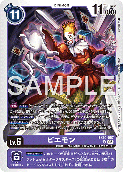 -Lv.6 Piedmon EX10-057 R mega | Virus | Wizard/Dark Masters [Hand] [Main] If you don't have any Digimon other than Digimon with [Dark Masters] in their texts, you may play this card with the play cost reduced by 5. At turn end, delete the Digimon this effect played. [On Play] [When Attacking] Delete 1 of your opponent's unsuspended Digimon. [All Turns] This Digimon can only digivolve into [Apocalymon]. [On Deletion] If you have no purple face-up security cards, place this Digimon face up as the bottom security card. --- [Security] If this card was face-up, you may play 1 level 5 or lower card with [Dark Masters] in its text from your hand or trash without paying the cost.