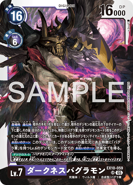 Lv.7 ダークネスバグラモン EX10-059 SR 究極体 | ウィルス種 | 合成型/バグラ軍 【登場時】【進化時】相手の手札1枚を見ないで選び、相手のデジモンの進化元の下かテイマーの下に置く。その後、自分のトラッシュから、特徴に「バグラ軍」を持つデジモンカード3枚をこのデジモンの進化元の上に置くことで、下にカードがある相手のデジモン/テイマー1体を消滅させる。 【お互いのターン】このデジモンは、このデジモンの進化元にある特徴に「バグラ軍」を持つLv.6のデジモンカード全ての【お互いのターン】効果全てを得る。 ---
