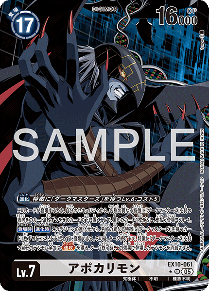 Lv.7 アポカリモン EX10-061 SR 究極体 | 不明 | 種族不明 このカードが登場するとき、自分のセキュリティから、名称の異なる特徴に「ダークマスターズ」を持つ表向きのカード1枚ずつをこのカードの下に置くことで、置いたカード1枚ごとに、支払う登場コスト-4。 【登場時】【進化時】このデジモンの進化元から、名称の異なる特徴に「ダークマスターズ」を持つカード1枚ずつをコストを支払わずに登場できる。その後、ターン終了まで、特徴に「ダークマスターズ」を持つ自分のデジモン全ては≪速攻≫を得る。ターン終了時、この効果で登場したデジモンを消滅させる。 ---
