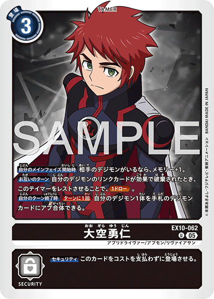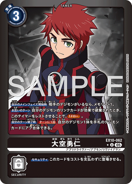 大空勇仁 EX10-062 U アプリドライヴァー/アプモン/リヴァイアサン 【自分のメインフェイズ開始時】相手のデジモンがいるなら、メモリー+1。 【お互いのターン】自分のデジモンのリンクカードが効果で破棄されたとき、このテイマーをレストさせることで、≪1ドロー≫。 【自分のターン終了時】[ターンに1回]自分のデジモン1体を手札のデジモンカードにアプ合体できる。 --- 【セキュリティ】このカードをコストを支払わずに登場させる。
