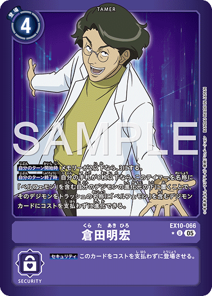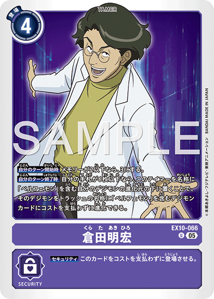 倉田明宏 EX10-066 U 【自分のターン開始時】メモリーが2以下なら、3にする。 【自分のターン終了時】自分の手札が6枚以下なら、このテイマーを名称に「ベルフェモン」を含む自分のデジモンの進化元の下に置くことで、そのデジモンをトラッシュの名称に「ベルフェモン」を含むデジモンカードにコストを支払わずに進化できる。 --- 【セキュリティ】このカードをコストを支払わずに登場させる。